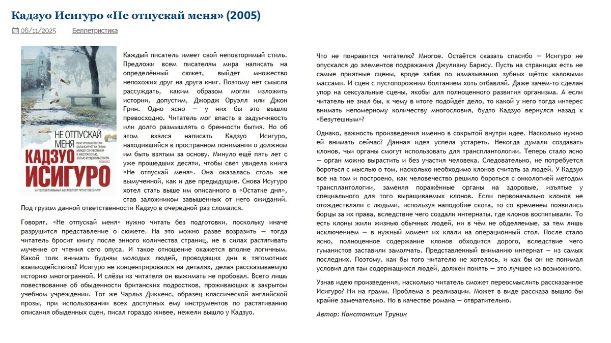 Кадзуо Исигуро "Не отпускай меня" (2005) | Критика