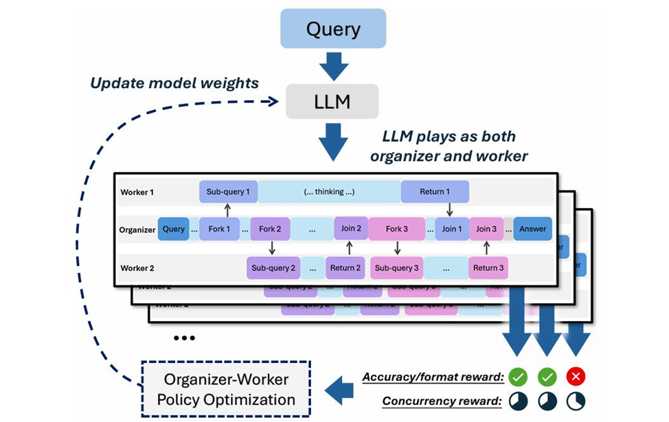 Исследовательская команда Microsoft представила AsyncThink — способ организации внутреннего рассуждения больших языковых моделей (LLM) в форме асинхронной «организации‑агентов», позволяющий моделям одновременно выступать и как «организатор», и как «исполнитель». По сути, это шаг от одиночного агента к организованной группе внутренних рабочих (worker) с протоколом Fork–Join; цель — повысить точность рассуждений и существенно снизить задержки. Ключевая идея AsyncThink строится вокруг протокола Organizer–Worker: Такая архитектура даёт возможность динамически менять топологию «мыслительного процесса», параллелить части решения и адаптироваться в ходе рассуждений. Двухэтапная схема обучения Результаты экспериментов Почему это важно Ограничения и риски Дальнейшие направления Авторы предлагают три вектора развития: Заключение: AsyncThink — важный шаг к практическим «интеллектуальным организациям», где внутренняя архитектура рассуждений становится гибким, параллельным и адаптивным инструментом