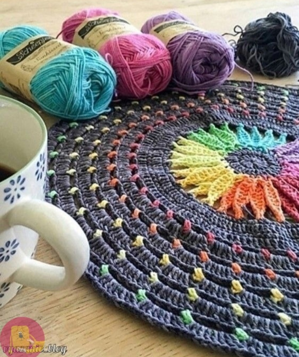 Для вдохновения , создаем уют в доме. Узор состоит из 2 рядов. В одном ряду вяжем цепочки из воздушных петель , присоединяемся между группами столбиков столбиками без накида. В следующем ряду под цепочки вяжем группы из столбиков с накидками. И обратите внимание группы столбиков в рядах отличаются колличество столбиков. Группы по три столбика , по два столбика и есть по четыре. Как будет выглядеть коврик и как справимся с прибавками это всё на собственном опыте. Такой коврик я не вязала , поэтому точно сказать не могу. Будет время наверное попробую повязать образец , начало коврика. И для коврика я использую остатки ниток и хорошо подходит так называемая ,, бабушкина ,, пряжа , карачаевская пряжа. Так что вот вам идея для коврика , экспериментируйте!