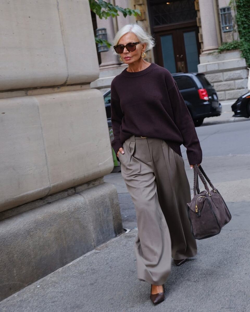 Современная классика — это про другие пропорции. Забудьте про всё, что ниже линии талии. Высокая посадка — это лучший друг после 60. Она не только создает красивый изгиб и удлиняет ноги, но и поддерживает область живота. Мой однозначный фаворит — прямые брюки из плотной шерсти или качественного твила.