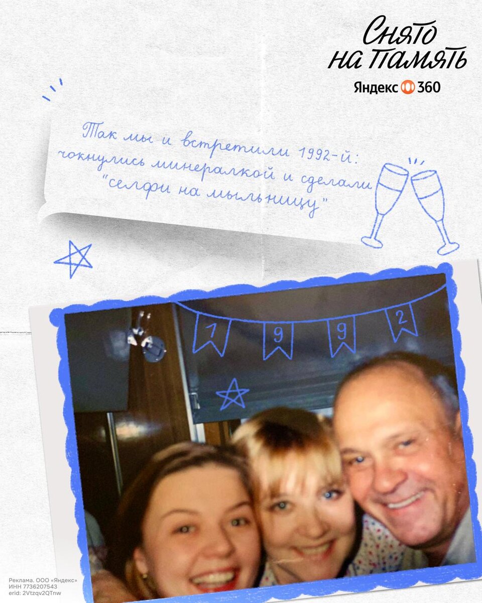 У админов есть немало историй про странные и провальные отмечания Нового Года, но историю Юлии Меньшовой про то, как она отметила 1992 год с родителями в поезде из Крыма, где перед съемками фильма их поселили в отель без отопления и горячей воды (это в декабре-то!), перебила их все.Остальные участники группы решили согреваться стандартным русским методом, причем прямо с восьми утра, но семье Меньшовых такой способ не зашел, так что семья отправилась в Москву на поезде, отходящем в 23:15 – греться. Отмечали, конечно же прямо в поезде – чокаясь минералкой История вышла в рамках спецпроекта Яндекс 360 «Снято на память», в котором собирают самые трогательные истории, которые меняют человека и его жизнь – не только про Новый год, но и про семью, соседей, и просто любимых людей. Кстати, пять участников смогут рассказать свою историю лично на шоу «Сама Меньшова».