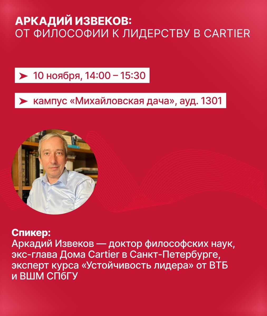 «Каждый, кто заходил в двери Cartier, должен был получать удовольствие. Наш прекрасный привратник, похожий на Санта-Клауса, каждого входящего встречал широкой улыбкой» На открытие MCW мы пригласили Аркадия Извекова, чтобы поговорить на тему лидерства в Cartier и исследовать связь между поиском истины и достижением прибыли. 📆 10 ноября, понедельник, 14:00-15:30 🙎♀️ Public talk, офлайн Спикер: Аркадий Извеков — доктор философских наук, экс-глава Дома Cartier в Санкт-Петербурге, эксперт курса «Устойчивость лидера» от ВТБ и ВШМ СПбГУ. Это уникальный шанс понять, как внутренние ценности могут стать основой для блестящей карьеры в мире высочайшего качества. Регистрация Никто не уйдет с мероприятия без порции удовольствия - огромной порции, как инкрустированный в брошь ювелирами Cartier алмаз "Звезда Южной Африки" (весом 83,5 карата!)☺️