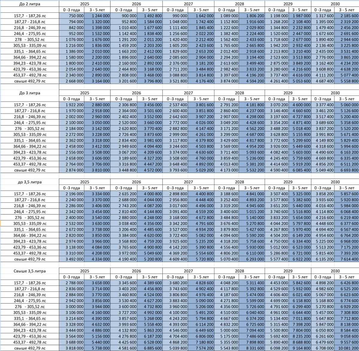 Автомобильный эксперт Дмитрий Рогов обнародовал обновленные данные о тарифах утилизационного сбора, поделившись ими в своем официальном Telegram-канале. Согласно предоставленной информации, новые ставки начнут действовать с декабря 2025 года и будут оставаться в силе до 2030 года. Для облегчения восприятия информации Рогов подготовил таблицу, где указал мощность двигателя в лошадиных силах (л.с.) и соответствующую стоимость утилизационного сбора в рублях. Важно отметить, что в международных расчетах применяется британская лошадиная сила, что следует учитывать при переводе мощности из кВт. По обновленным данным, для автомобилей младше трех лет с двигателем объемом до 2 литров и мощностью от 157,7 до 187,26 л.с., размер утилизационного сбора с декабря 2025 года составит 750 000 рублей. К 2030 году эта сумма увеличится до 1 310 000 рублей. Для транспортных средств с объемом двигателя до 3 литров и мощностью от 276 до 305,52 л.с., утилизационный сбор в 2025 году будет равен 2 180 000 рубле