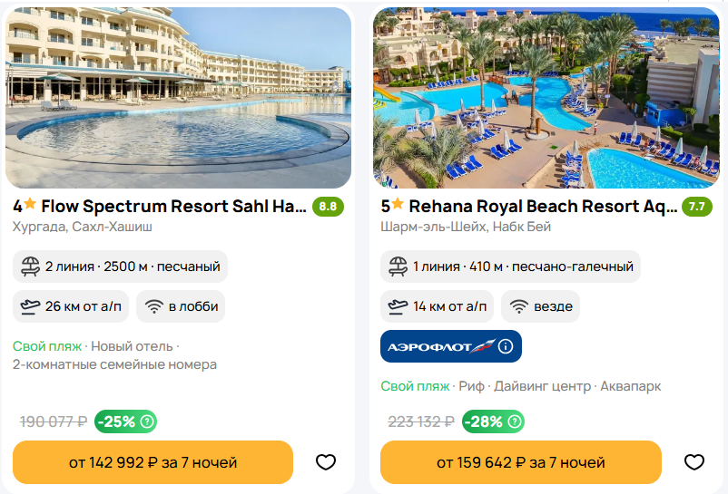 🔥Туры в Египет "всё включено" из Москвы от 7 ночей на Новый Год🔥 Парочка выгодных вариантов: Тур в отель 4⭐️Flow Spectrum Resort Sahl Hasheesh, 2 линия, Хургада, 7 ночей, ультра всё включено, прямой чартерный. Вылет 25 декабря, от 71496 руб/чел Забронировать: https://checkintime.ru/j1gp Тур в отель 5⭐️Rehana Royal Beach Resort Aquapark & Spa, до пляжа 410 м, Шарм-эль-Шейх, 7 ночей, всё включено, прямой чартерный. Вылет 25 декабря, от 79821 руб/чел Забронировать: https://checkintime.ru/5u34 Тур в отель 5⭐️Safir Sharm Waterfalls Resort, до пляжа 300 м, Шарм-эль-Шейх, 7 ночей, всё включено, прямой чартерный. Вылет 25 декабря, от 83192 руб/чел Забронировать: https://checkintime.ru/qijx Все предложения: https://checkintime.ru/im2u ⚠️Рассрочка на 120 дней без переплаты! Цены на момент публикации и указаны на одного человека с перелетом и проживанием. Переходя по ссылке цена отобразиться на 2-х человек 🏖 Поиск туров | ✈️Авиабилеты