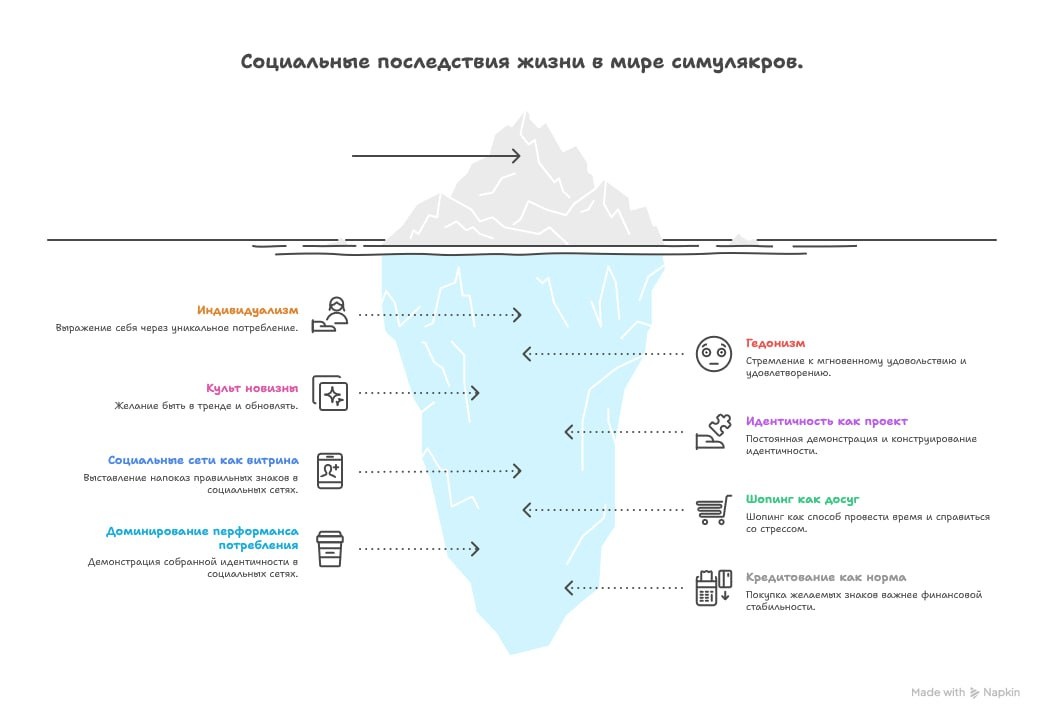 Социальные последствия: жизнь в мире симулякров Анализ Бодрийяра и Баумана точно описывает социальные практики XXI века. Доминируют индивидуализм (я выражаю себя через уникальный набор потребленного), гедонизм (стремление к мгновенному удовольствию) и культ новизны (обновлять — значит быть в тренде). Девизом эпохи становится: «Я потребляю, следовательно, я существую». Идентичность — это «проект», который мы вынуждены постоянно демонстрировать. Социальные сети превращаются в витрину этого проекта, где мы перформативно выставляем напоказ правильные знаки: кофе, еду, путешествия, бренды. «Ты — то, что ты потребляешь» — больше не метафора, а руководство к действию. Шопинг превращается в досуг и терапию. Поход в торговый центр становится способом провести время и справиться со стрессом. Перформанс потребления доминирует и в соцсетях. Селфи из кофейни, распаковка нового гаджета — все это демонстрация «правильно» собранной идентичности. Кредитование становится нормой. Возможность купить же