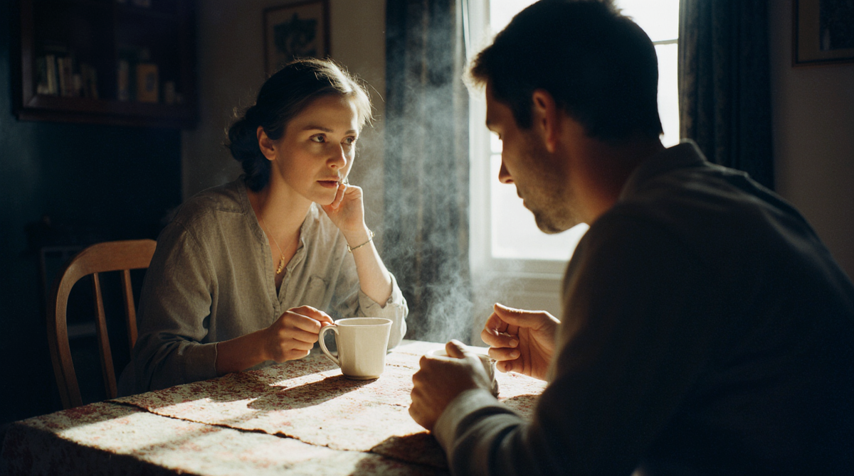 Долгая пауза. Елена смотрела в окно, держала трубку. Максим вошёл на кухню, увидел её лицо, замер.