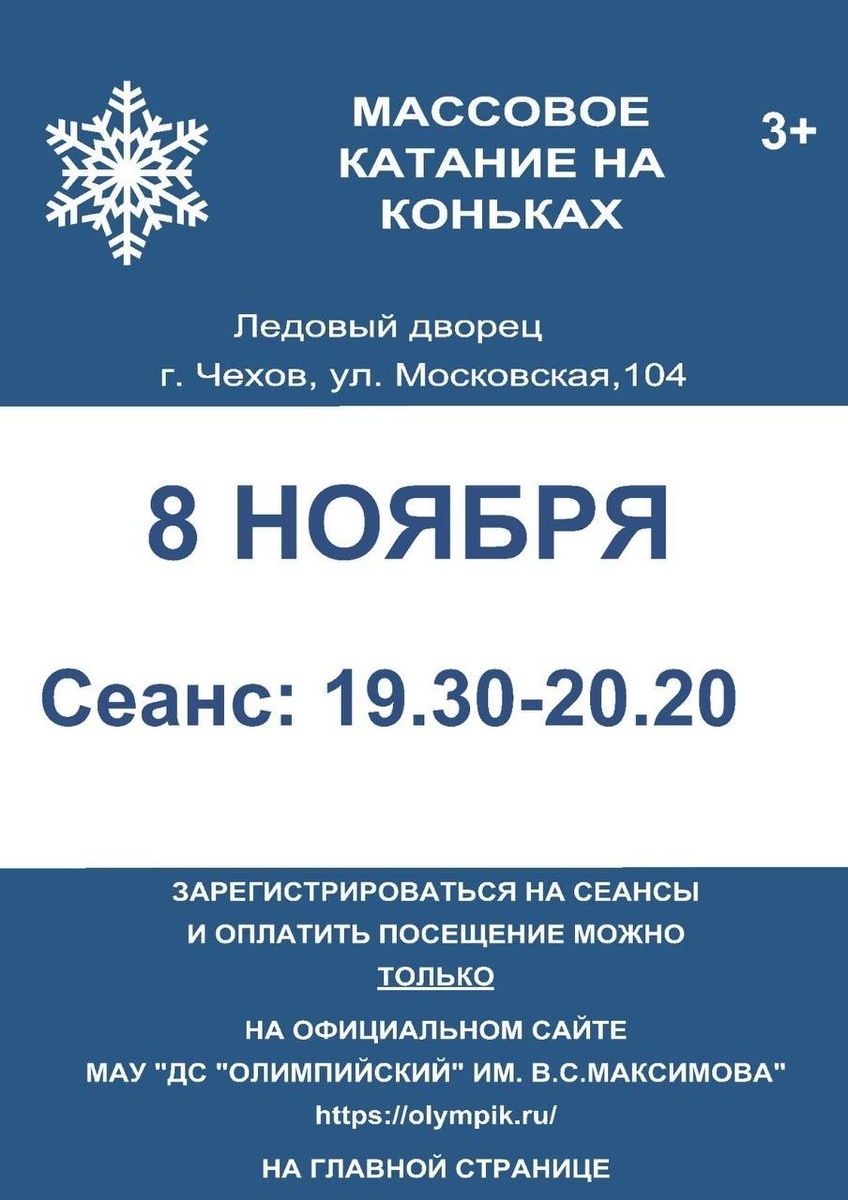 ✨ МАССОВОЕ КАТАНИЕ В ЛЕДОВОМ ДВОРЦЕ 8 ноября в муниципальном округе Чехов пройдет массовое катание на коньках ⛸️ Сеанс: 19:30 - 20:20 📍Ледовый дворец, ул Московская 104 🎵 К вашим услугам качественный лед, хорошая музыка, прокат и заточка коньков. ℹ️ Размеры коньков: с 27 по 46. 💵 Стоимость проката: детские 200 руб., взрослые 300 руб. Зарегистрироваться на сеансы и оплатить посещение/прокат можно на официальном сайте МАУ «ДС «Олимпийский» им. В.С. Максимова» на главной странице - olympik.ru/ 🏢 Дворец спорта Олимпийский имени В.С. Максимова 📍 г. Чехов, ул. Полиграфистов, стр.30 👉 Прислать новость 💥 Проект "Чехов Детям"