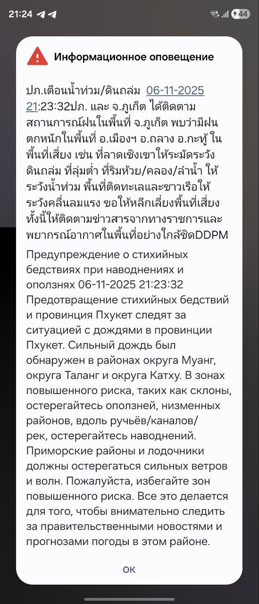 Предупреждение о стихийных бедствиях при наводнениях и оползнях 06-11-2025 21:23:32 Предотвращение стихийных бедствий и провинция Пхукет следят за ситуацией с дождями в провинции Пхукет. Сильный дождь был обнаружен в районах округа Муанг, округа Таланг и округа Катху. В зонах повышенного риска, таких как склоны, остерегайтесь оползней, низменных районов, вдоль ручьёв/каналов/ рек, остерегайтесь наводнений. Приморские районы и лодочники должны остерегаться сильных ветров и волн. Пожалуйста, избегайте зон повышенного риска. Все это делается для того, чтобы внимательно следить за правительственными новостями и прогнозами погоды в этом районе.