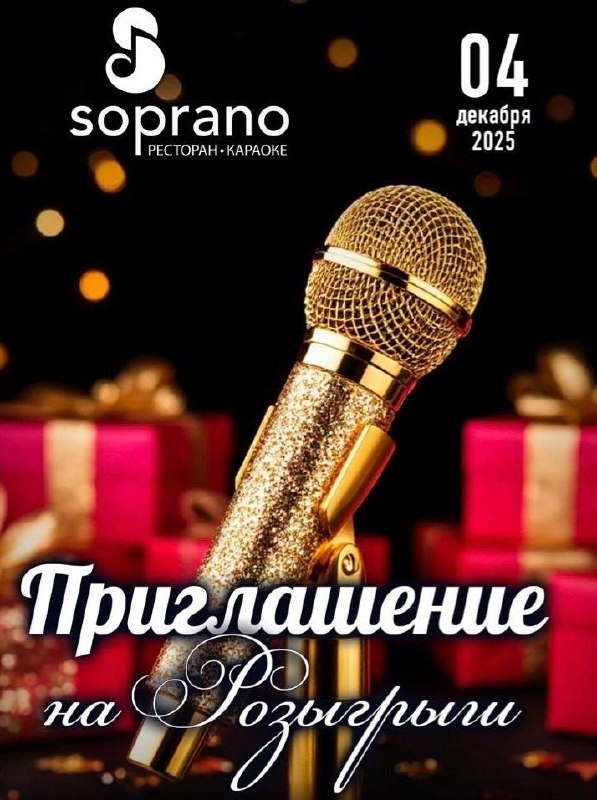 💎💎💎💎💎💎💎💎💎💎💎 Ежегодный розыгрыш призов в караоке-клубе Soprano! 04.12.2025 Сбор гостей: в 21:00 — этот вечер войдет в историю! Только раз в году — грандиозный розыгрыш подарков, море хитов и сумасшедшая атмосфера. Вас ждет: 🎁 Грандиозный розыгрыш крутых призов 🎶 Море хитов и сумасшедшая атмосфера 📸 Фотограф и видеограф — ваши лучшие моменты останутся на память! Резерв столов по телефону: +7 (812) 409-92-29 *Количество мест ограничено — не упустите свой шанс стать обладателем ГЛАВНОГО ПОДАРКА!