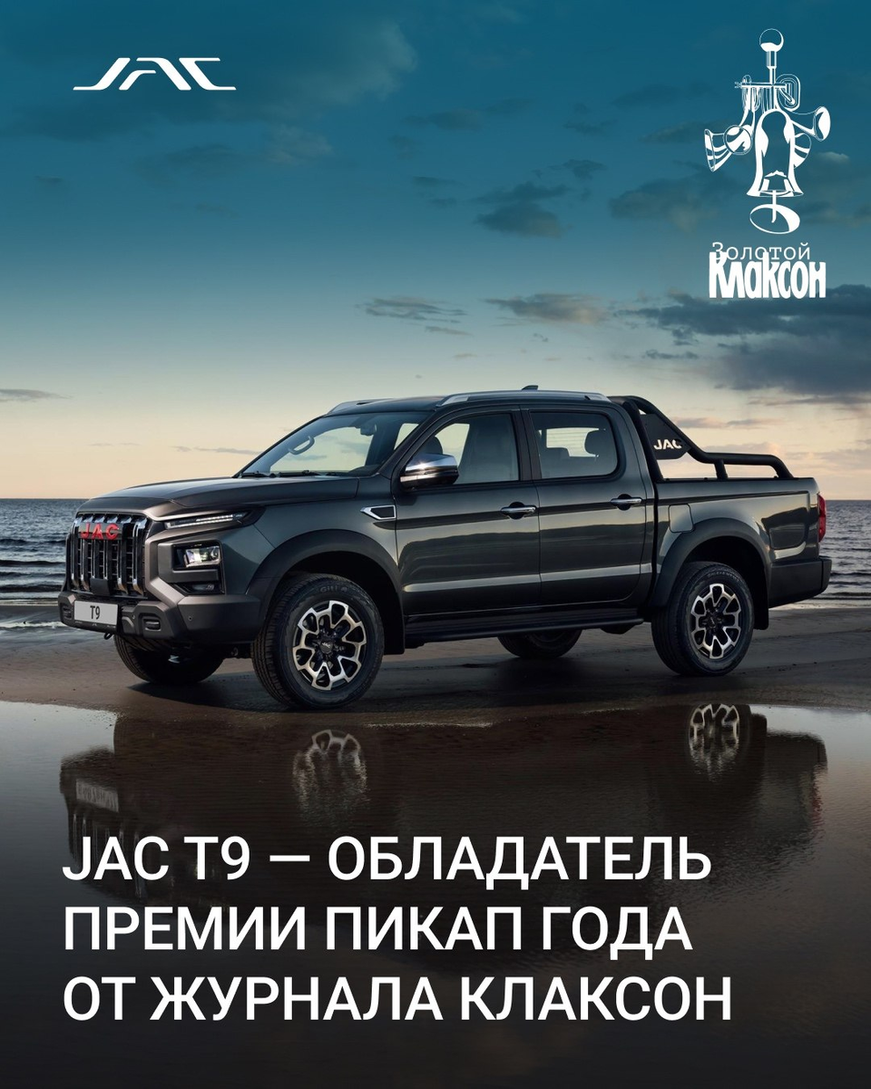 • JAC T9 стал победителем премии «Золотой Клаксон» - 2025 в номинации «Пикап года». • В онлайн-голосовании приняли участие десятки тысяч читателей одного из старейших российских автомобильных изданий – газеты «Клаксон». Оставаясь уверенным лидером в сегменте пикапов, и благодаря выходу на рынок дизельной версии, наш флагман T9 в сентябре увеличил отрыв от ближайших конкурентов и вышел на недосягаемый уровень – каждый пятый (20% сегмента) официально проданный пикап в РФ – JAC T9. И эта премия подчеркивает доверие российских потребителей, подтверждая, что пикап JAC наилучшим образом соответствует запросам и ожиданиям водителей в этом классе автомобилей. «Для нас награда «Золотой Клаксон» имеет особую ценность, потому что это – лучшая обратная связь от наших клиентов. Мы знаем, что люди ценят в пикапах – это, в первую очередь, надежность, проходимость и хорошая грузоподъемность. Когда ко всем практическим качествам добавляется еще комфорт и стильный дизайн – получается лучший пикап. Мы ра