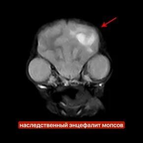 #БОЛЕЗНИ_СОБАК НАСЛЕДСТВЕННЫЙ ЭНЦЕФАЛИТ МОПСОВ (НЭМ) ❗️ Это тяжелое, прогрессирующее и, как правило, фатальное неврологическое заболевание, вызванное генетической предрасположенностью. ⚠️ Симптомы Клинические признаки обычно проявляются у молодых собак (в среднем от 1,5 до 2,5 лет), чаще у самок палевого окраса, и быстро прогрессируют. Симптомы включают: ➡️ судороги и эпилептические припадки ➡️ нарушение координации движений (атаксия) и походки ➡️ изменения в поведении (агрессия, апатия, дезориентация) ➡️ нарушения зрения, вплоть до слепоты ➡️ хождение по кругу, наклон головы ➡️ летаргия и снижение реактивности 🩺 Диагностика Для диагностики НЭМ используются следующие методы: ➡️ неврологический осмотр и сбор анамнеза ➡️ МРТ (магнитно-резонансная томография) головного мозга, которая выявляет очаги воспаления и некроза (отмирания тканей) ➡️ анализ спинномозговой жидкости (ликвора), который часто показывает аномальные изменения, включая лимфоцитарный плеоцитоз ➡️ генетическое те