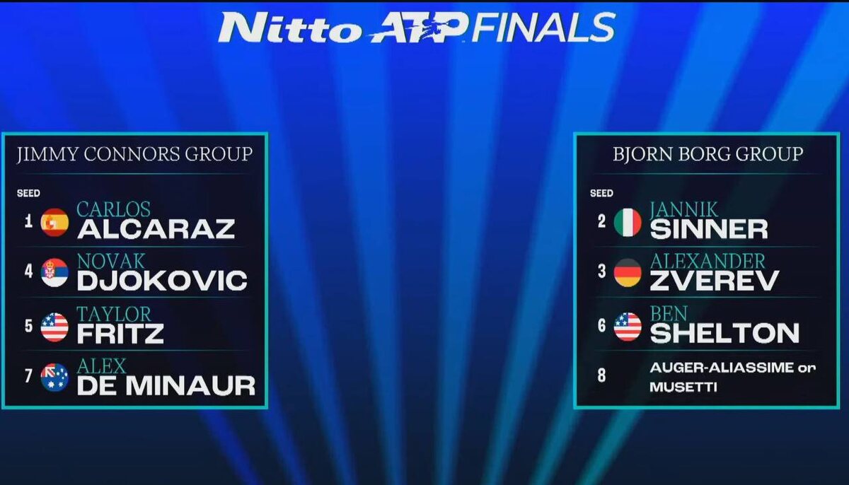 Привет, друзья! Сегодня мы разберём составы групп на итоговом турнире АТР, который пройдёт в Турине с 9 по 16 ноября. Призовой фонд соревнований составит 15,5 миллиона долларов, что делает этот турнир одним из самых престижных в году. В группе Джимми Коннорса собрались сильные игроки: испанец Карлос Алькарас (1-й номер посева), серб Новак Джокович (4), американец Тейлор Фриц (5) и австралиец Алекс де Минаур (7). Эти спортсмены представляют разные стили игры и подходы к турнирам, что обещает захватывающие матчи и непредсказуемые результаты. В группе Бьорна Борга выступят первая ракетка мира итальянец Янник Синнер (2), немец Александр Зверев (3) и американец Бен Шелтон (6). Последний участник определится позднее, но уже сейчас можно сказать, что группа обещает быть интересной и конкурентной. Этот турнир — отличная возможность для игроков продемонстрировать свои лучшие качества и побороться за звание чемпиона. Кто из них завоюет титул? Следите за новостями и не пропустите захватывающие ма