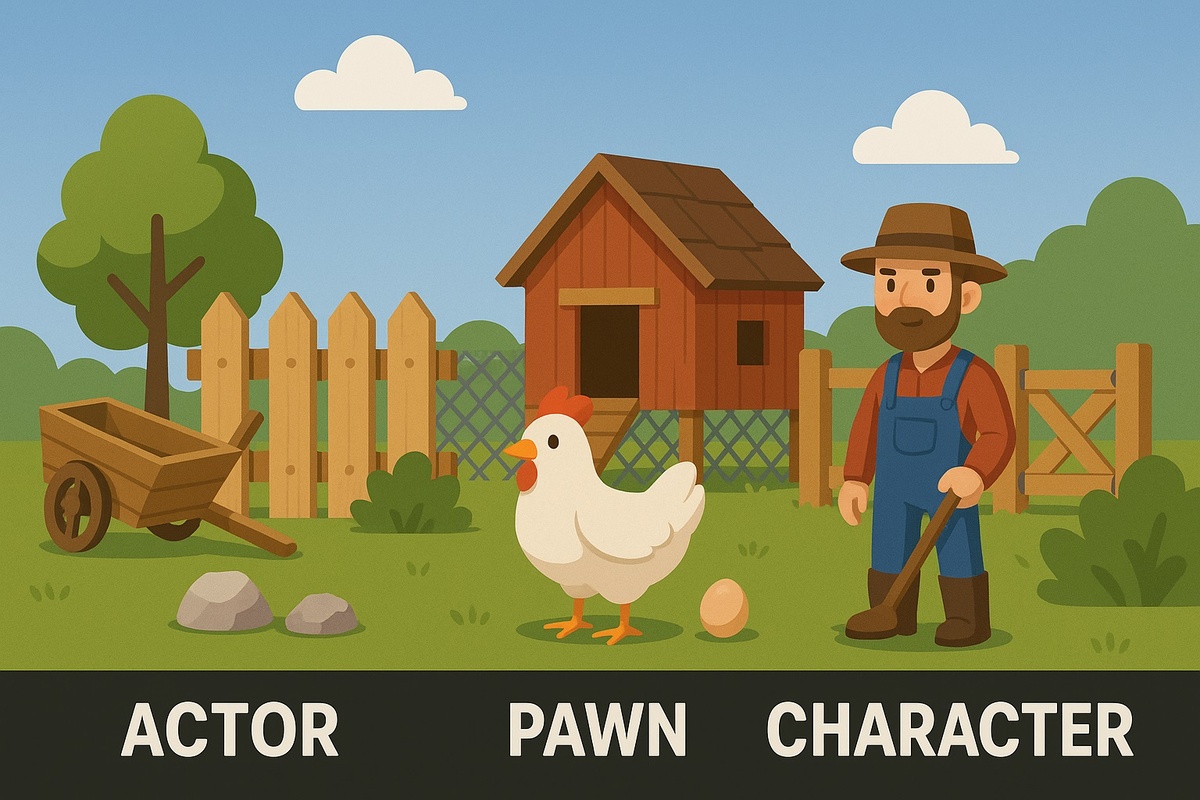 Всем привет! Давайте представим, что мы разрабатываем игру про птицеферму и у нас есть множество ассетов: куры, яйца, цыплята, курятник, кормушки, заборы, ворота, сетка-рабица, тележки, мешки с кормом, камни, кусты, деревья и много-много всего. Все это можно разместить на сцене, а значит, все это акторы (Actors). Actor — это базовый класс всех объектов, которые могут существовать в игровом мире. Актор может включать в себя различные компоненты (Components), которые определяют его внешний вид, поведение и взаимодействие с окружением. Например, забор состоит из Static Mesh Component, а лампочка может иметь сразу несколько компонентов: Static Mesh Component (корпус лампы), Point Light Component (свет), Audio Component (звук). И лампа, и забор — это акторы. Они просто существуют в мире, но сами по себе ничего не делают, если их логика не прописана вручную. Иерархия Актора и его подклассов выглядит так: Pawn — наследник Актора, может управляться игроком или ИИ. Сам по себе Pawn не умеет ход