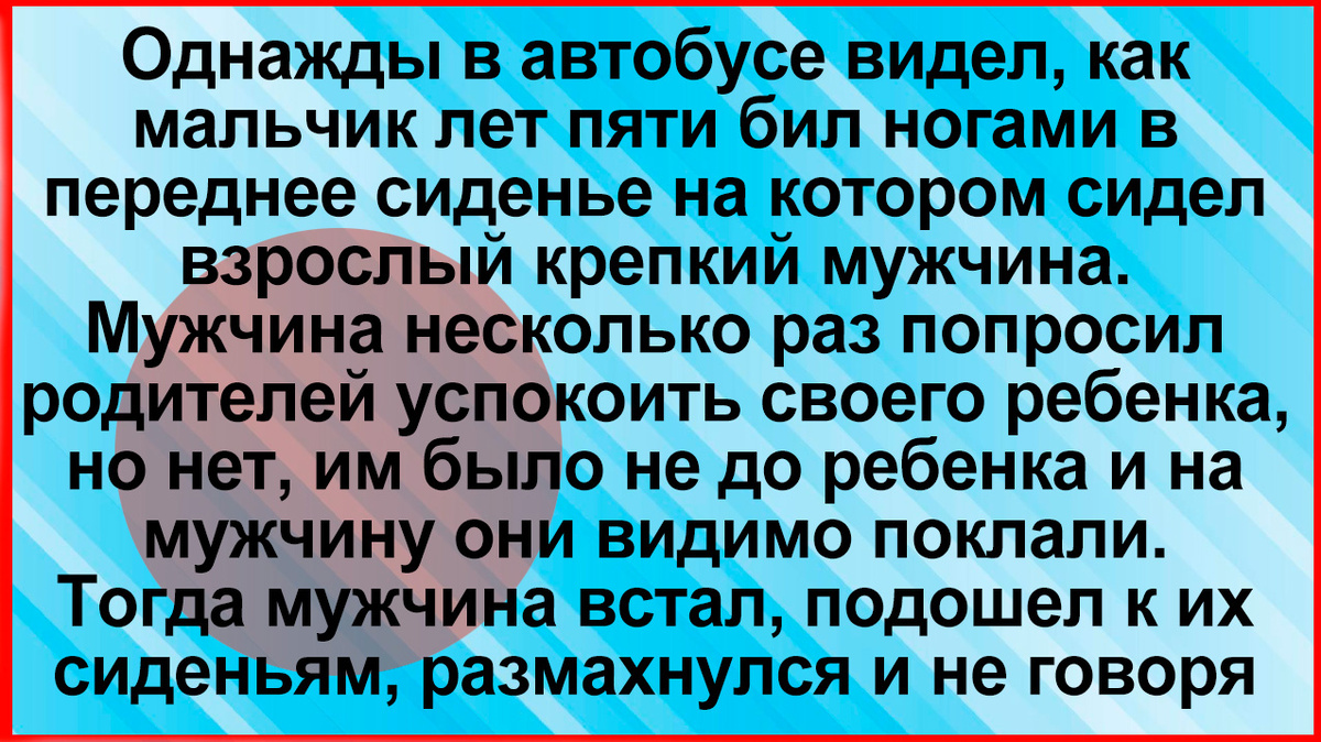 Тогда мужчина встал повернулся и ударил ладонью не сильно по щеке мальчика. Родители подняли визг, тогда он так же, но уже сильно, ударил отца а затем и мать. И тишина. И никто в автобусе его не осудил.