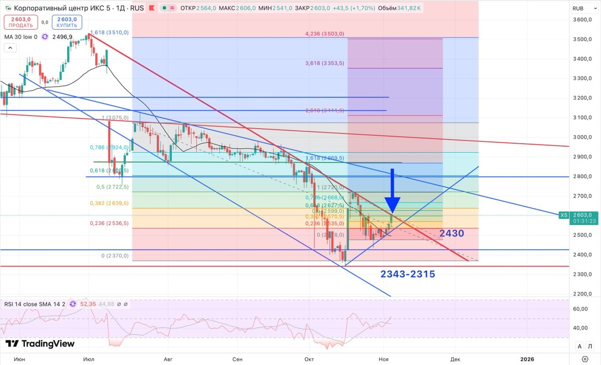 Цена Х5 подошла к важному уровню сопротивления. Тут и нисходящая линия сопротивления и уровень по Фибо. Обычно в таких местах, как минимум, бывает откат. Но в последнее время Х5 ведет себя сильнее рынка. Очевидно рынок ждёт объявление дивидендов в ноябре 💰 Жду, что под объявление дивов по-любому тренд будет пробит вверх и бумага к отсечке вырастит, как минимум, на величину дивидендов 🤞 Ждём дивы для подарков на Новый Год 🎅