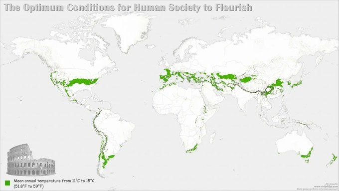 Карта оптимальных климатических зон для жизни и развития человечества. От нас далеко. Но наши предки, как и предки других северян - германских народов и скандинавов - потому такие деятельные были всю дорогу. Климат способствовал. Иначе было не выжить. ЛИ́НДРЕ 🫧