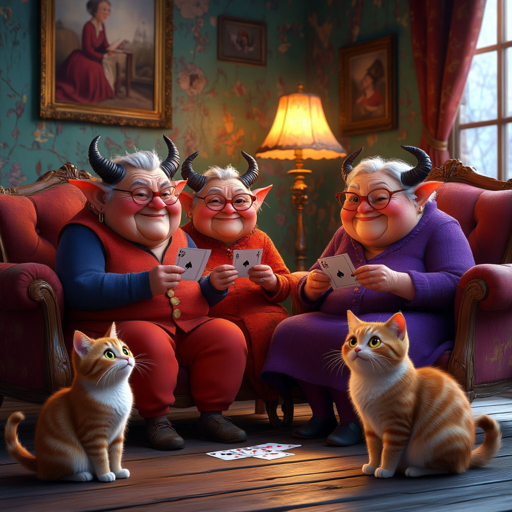И пошла по Аду слава о бабке Мане с её котами и ручными чертями. Стали к ним в гости заглядывать другие грешники – кто погреться у кошачьей кучи, кто послушать бабкины сказки да чертячий, хвостом виляющий, хор. И мало-помалу уголок бабы Мани стал самым уютным и душевным местом во всём Аду. Черти, наученные бабкой, теперь не тыкали грешников вилами, а вежливо предлагали чай из самовара, что вечно пузырился на угольках, и спрашивали: «Не нужна ли вам психологическая помощь? Может, котика погладить?»