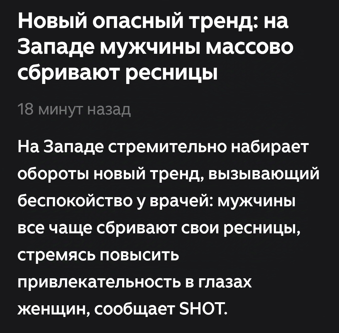 Я конечно понимаю, что за последние годы мир моды и красоты пережил немало неожиданных изменений. Одним из последних новшеств стало появление необычного тренда среди мужчин — полное удаление собственных ресниц. Этот смелый эксперимент с собственной внешностью быстро привлек внимание общественности и породил множество дискуссий относительно эстетики, здоровья и мотивации такого шага.