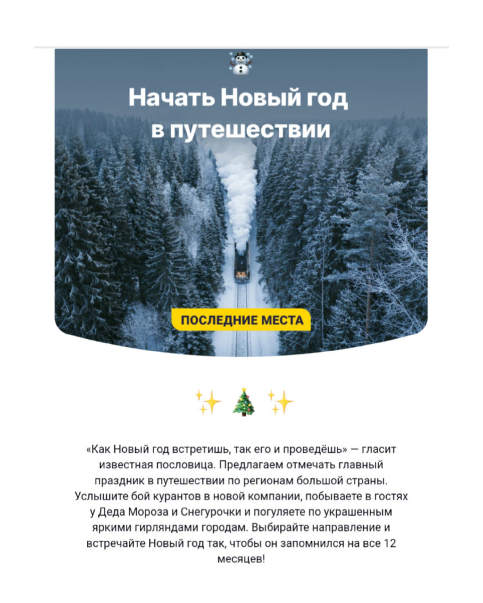 **❄️ ! ❄️** «Как Новый год встретишь, так его и проведёшь» — гласит известная пословица. А мы предлагаем отмечать главный праздник в году не у телевизора, а в путешествии по регионам нашей большой страны! ✨ Услышите бой курантов в новой компании ✨ Побываете в гостях у Деда Мороза и Снегурочки ✨ Погуляете по городам, украшенным яркими гирляндами Выбирайте направление и встречайте Новый год так, чтобы он запомнился на все 12 месяцев! 👉 **Последние места уже на сайте проекта!** Не откладывайте — зимняя сказка ждёт вас! Подборка лучших туров здесь 🔗