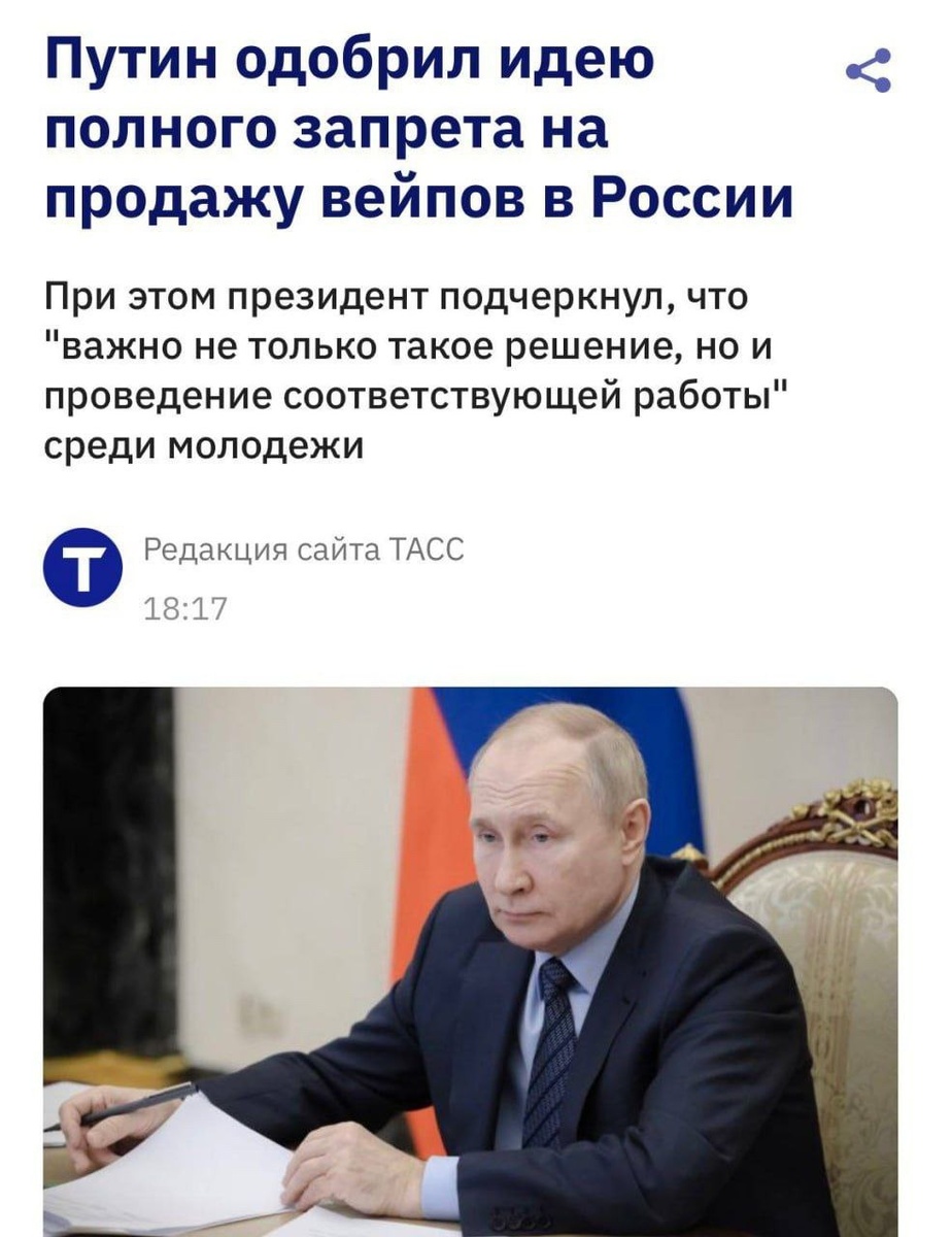 🚭 Путин одобрил полный запрет вейпов в России Президент поддержал идею убрать электронные сигареты из продажи совсем. Официально о решении Путин заявил вчера в Самаре, встретившись с активистами движения «Здоровое Отечество». Вице-премьер Чернышенко кивнул в знак согласия — правительство тоже за запрет. Путин подчеркнул: просто запретить недостаточно, нужна работа с молодежью. Летом президент уже одобрил эксперимент в Нижегородской области. Теперь в Госдуме готовят законопроект на полный запрет оборота. По словам Володина, за это выступает большинство депутатов. Похожие меры уже действуют в странах СНГ и других государствах.