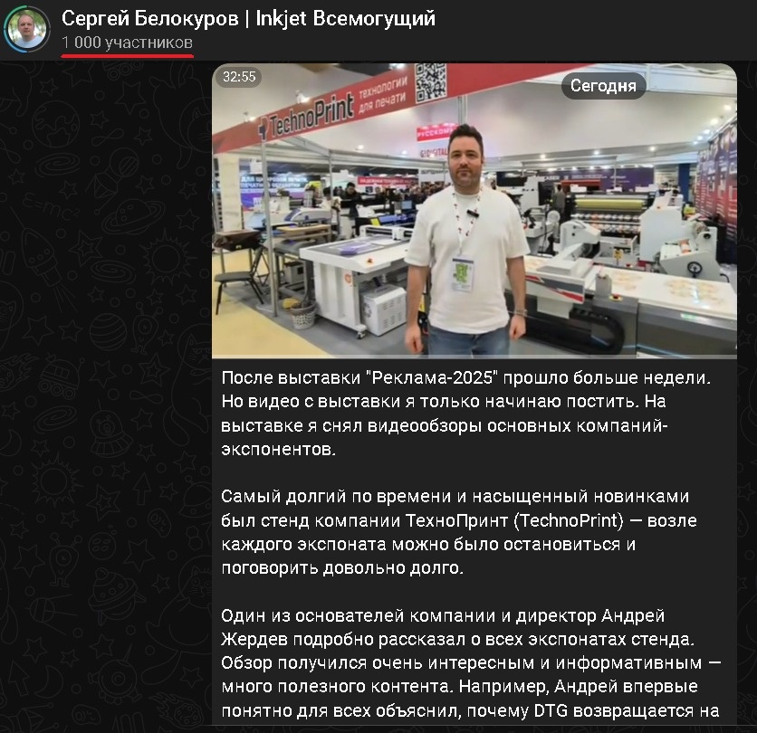 Вчера днем случилось замечательное событие. Мой Telegram-канал перешагнул цифру в 1000 подписчиков. Спасибо всем, кто подписался, или кто читает меня без подписки. Буквально чуть больше чем за год я достиг такого результата благодаря вам. Знаю, многие не замечали, смеялись. Но мой путь блогера струйной печати показал правильность выбора и высокую потребность в таком виде контента. Я тут немного приболел. Но стараюсь выпускать контент в таком же графике, как и раньше. Из интересного, в самое ближайшее время будет объявлено о новых мероприятиях, которые связаны со струйной печатью, но на разных рынках. Далее мне предлагают проводить тест-драйвы и устраивать батлы, чего никогда в нашей индустрии не было и что никто не может сделать. И еще куча других идей, которые я буду реализовывать, и надеюсь, что к 2 тысячам подписчиков удастся добраться быстрее. Первым делом размещаю посты тут — https://t.me/sergeybelokurovinkjet