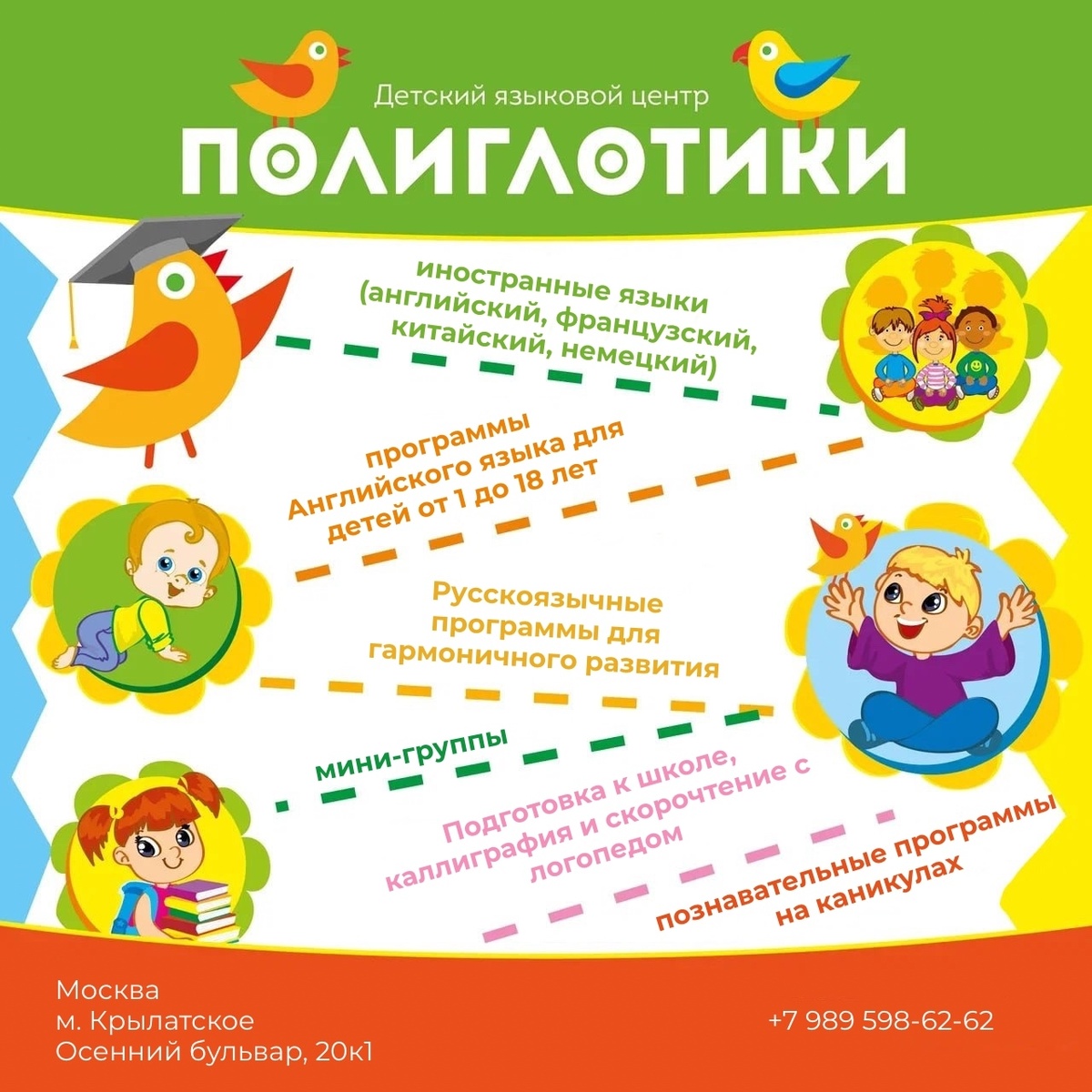 Полиглотики Крылатское - это уютный детский центр в шаговой доступности от метро, где дети от 1 года, школьники и взрослые изучают иностранные языки, осваивают такие интересные курсы как каллиграфия и скорочтение, мнемотехника и ментальная арифметика, а также успешно готовятся к поступлению в школу! В нашем центре вы можете познакомиться с авторскими курсами: Полиглотики - место, где Ваш ребёнок полюбит учёбу, обретет уверенность в своих силах и получит полезные знания и умения для успешного старта!