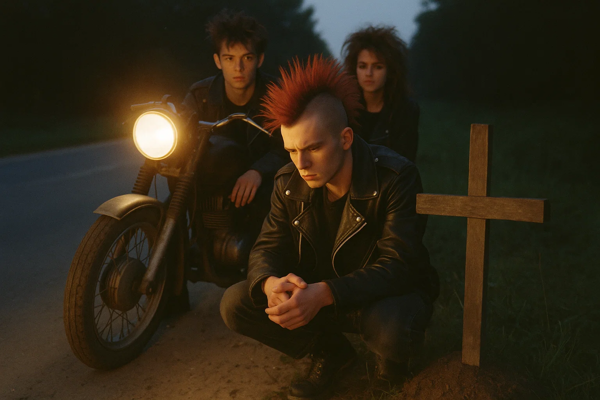 Это было лет двадцать назад, но даже сейчас, когда я вспоминаю, по спине бегут мурашки. Мне тогда было всего тринадцать — тощий подросток с косичками и вечным любопытством, — а эти трое казались богами хаоса: взрослые, неуязвимые, с запахом бензина и сигаретного дыма. Их звали Андрей, Вася и Колька. Шестнадцать-семнадцать лет, панковские прически, рваные джинсы и мотоциклы, собранные из обломков чужих машин. Они ревели моторами по пыльным дорогам, пили дешёвое пиво у реки и курили что-то, от чего воздух дрожал, как в жару. Деревня наша была тихой, сонной — бабушки вязали на крыльцах, коровы мычали в тумане, — но эти парни вносили в неё вихрь свободы и беды.