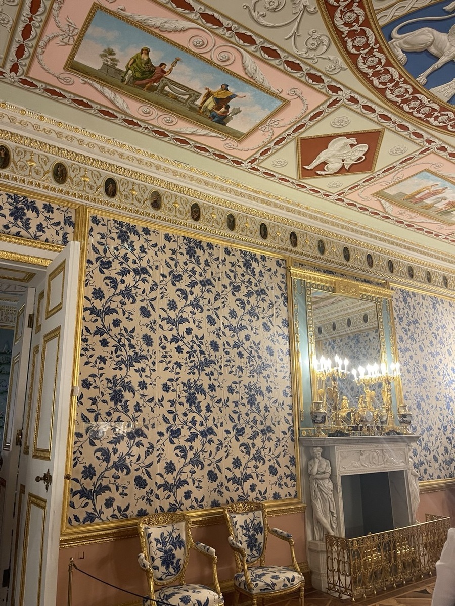 Как будто кобальтовая сетка, наша фарфоровая, правда? И опять у нас создаётся впечатление, что мы как будто маленькие жители каких-то крохотных объемов. Предыдущий интерьер - китайская лаковая шкатулка, а здесь фарфоровая табакерка… ну, или что-то в этом роде😺