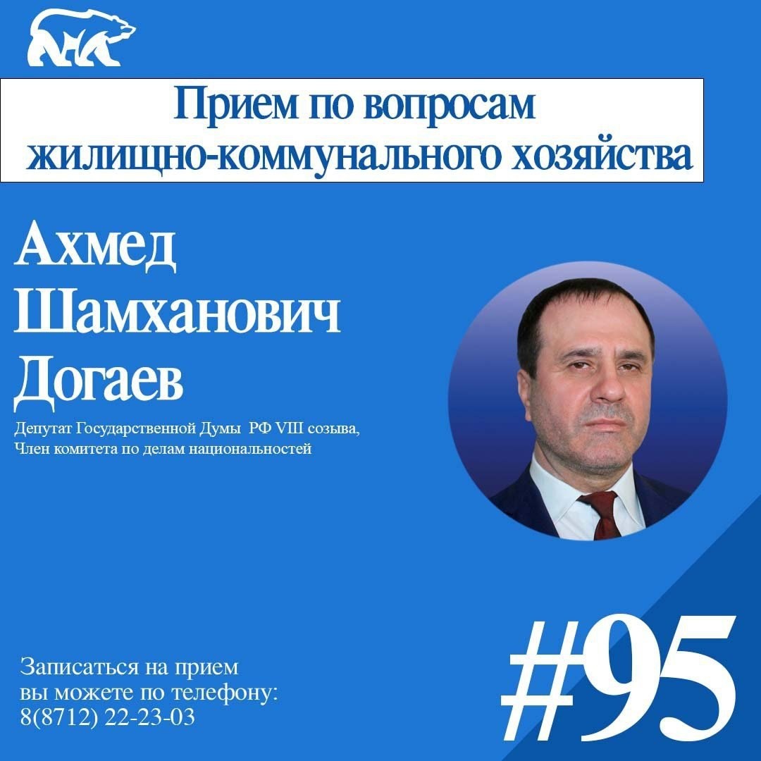 🗓 7 ноября 2025 года дистанционный прием граждан по вопросам жилищно-коммунального хозяйства проведет депутат Государственной Думы Федерального Собрания Российской Федерации VIII созыва, член Комитета Государственной Думы по делам национальностей Ахмед Догаев. ⠀ ✍🏻Записаться на прием или задать вопрос устно можно: ⠀ ☎️ по телефону: 8 (8712) 22-23-03 ⠀ 📩 Отправив обращение по почте: 364021, г. Грозный, пр. А. Кадырова, 3/25, Бизнес-Центр, 4 этаж или бросить в почтовый ящик для письменных обращений на 1м этаже Бизнес - Центра. ⠀ 📥 Также направить письменное обращение по электронной почте: op@chechen.er.ru. ⠀ #ЕдинаяРоссия #ЕРпомогает95 #ЕР95