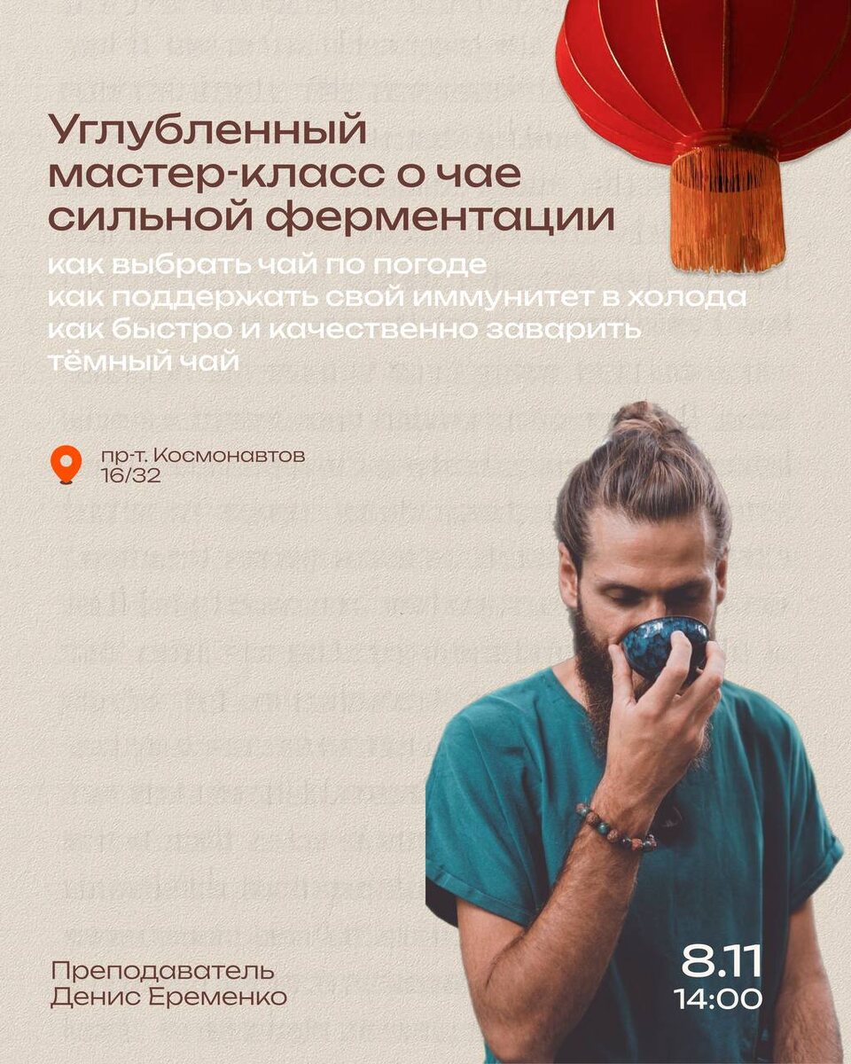 Ноябрь. Ветер. Холод Но мы знаем один секрет, который поможет тебе легче перенести это время года. 8 ноября в 14:00 приглашаем тебя на углубленный мастер-класс о чаях сильной ферментации, где ты узнаешь главные секреты: - как отличать разные типы темных чаев - какой чай тебя согреет - как помочь своему организму не заболеть. Приходи - будет вкусно, уютно, душевно и тепло. Да, кстати, мероприятие пройдет в новой Чайной Истории на пр-т. Космонавтов 16/32 Билет: 2000 р Запись: @chaystory_online