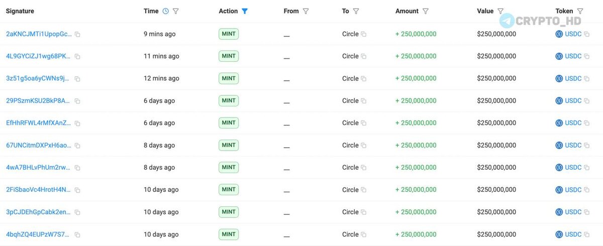 #usdc #альткоины 🤔 Компания Circle напечатала 5,250,000,000 USDC c момента обвала рынка 10 октября. Сегодня: +750,000,000 USDC (solscan) …возможно, это те самые «новые деньги» необходимые для начала альтсезона. Cryptо Headlines