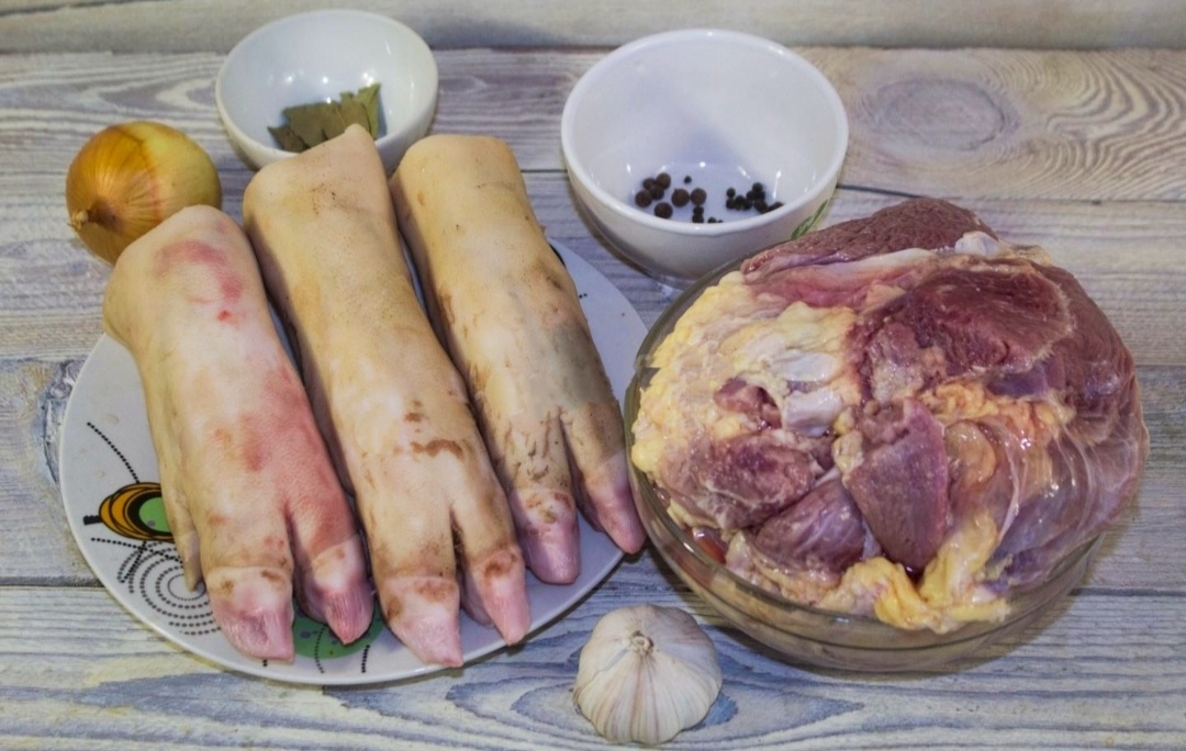 Друзья, добро пожаловать на мой канал! 🤗 Представляю вашему вниманию шикарный рецепт холодной закуски, знакомый многим с детства. Холодец из свиных ножек и говядины отличается великолепным вкусом, прекрасным внешним видом и отменной способностью застывать естественным образом, без добавления желатина. Этот деликатес обязательно украсит ваш праздничный стол и сделает праздник незабываемым! Приступим к готовке...👇 ⎯⎯⎯⎯⎯⎯⎯⎯⎯⎯ Ингредиенты: - Свинина (ножки) — 1,2 кг - Говядина — 1,5 кг - Вода — 3 литра - Репчатый лук — 1 шт. - Морковь — 1 шт. - Перец черный горошком — по вкусу - Душистый перец — 10 шт. - Чеснок — 10 зубчиков - Лавровый лист — 6 шт. ⎯⎯⎯⎯⎯⎯⎯⎯⎯⎯ Приготовление: 1) Подготовьте необходимые ингредиенты заранее. Замороженное мясо лучше оставить на ночь в холодильнике для полного размораживания. 2) Хорошо промойте свиную ногу, очистите её и оставьте на ночь в воде. Это позволит избавиться от крови и придаст готовому блюду красивый прозрачный вид. 3) Промойте ещё раз мясо утром