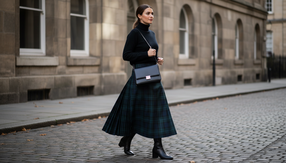 Основа: Килт-миди в красно-черную клетку.Верх: Черная кашемировая водолазка или тонкий свитер.Обувь: Тяжелые ботинки на шнуровке.Аксессуары: Плотные черные колготки, серебряные цепи, сумка-портфель. Этот образ демонстрирует силу и уверенность, играя на контрасте традиционной формы и агрессивных деталей.