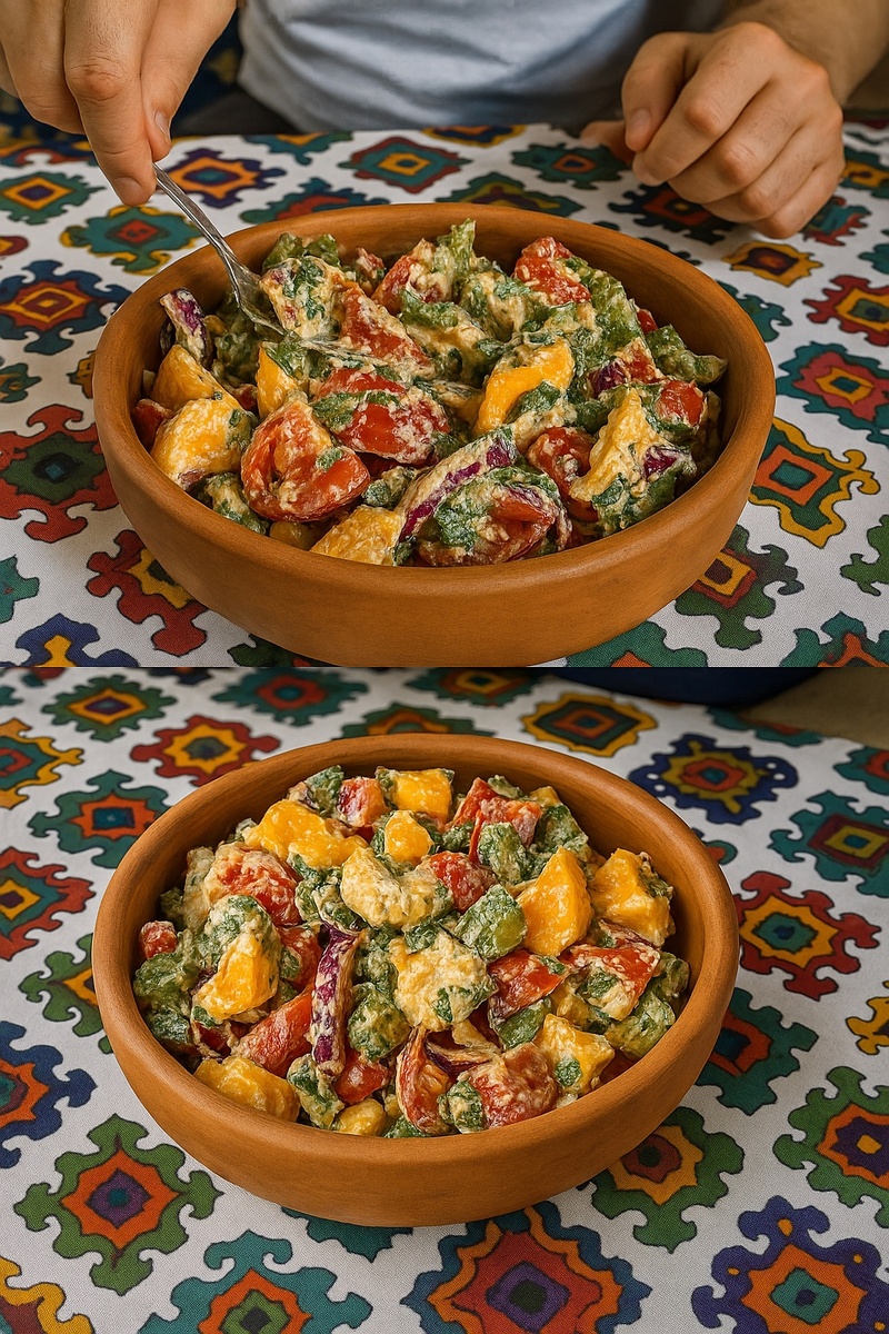 Вот как я однажды попробовала этот салат на кавказской свадьбе — и всё, с тех пор он у меня в сердце (и в меню). Грузинская кухня — это про щедрость, яркость и баланс. Этот салат как раз такой — сочный, с хрустом, с ореховой ноткой и острым акцентом. Ароматный витаминный салат с ореховой заправкой и пикантной зеленью ИНГРЕДИЕНТЫ (на 2 порции): ✅ Помидоры (красный + жёлтый) — 2 шт. ✅ Болгарский перец — 1 шт. ✅ Огурцы — 2 шт. ✅ Синий лук — 1 шт. ✅ Кинза — 50 г ✅ Базилик (фиолетовый) — 15 г ✅ Острый перец — 10 г ✅ Грецкие орехи — 50 г ✅ Яблочный уксус — 25 г ✅ Сванская соль — по вкусу ✅ Оливковое масло — 3 ст.л. ПРИГОТОВЛЕНИЕ: 1. Овощи: - Помидоры, огурцы и перец нарежьте крупными дольками - Лук — полукольцами 2. Зелень: - Мелко порубите кинзу, базилик и острый перец 3. Заправка: - Измельчите орехи в блендере с уксусом - Добавьте оливковое масло и сванскую соль 4. Сборка: - Смешайте все ингредиенты в салатнице - Перемешайте салат аккуратно, чтобы сохранить форму овощей СОВЕТ: • Под