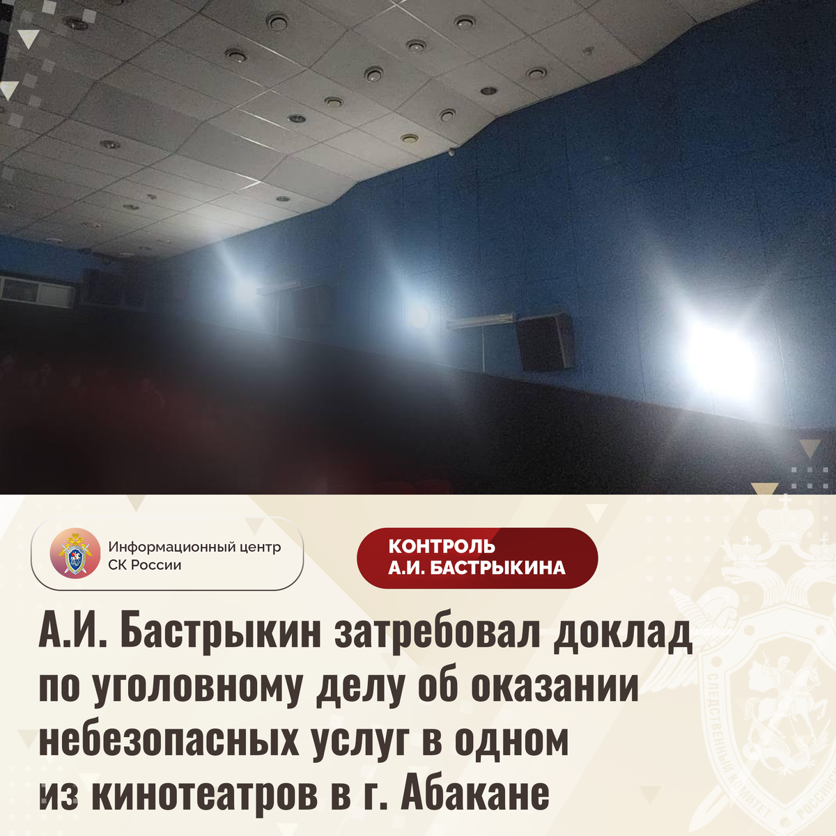 А.И. Бастрыкин затребовал доклад по уголовному делу об оказании небезопасных услуг в одном из кинотеатров в г. Абакане В эфире федерального телеканала сообщалось, что в ноябре текущего года в одном из кинотеатров города Абакана во время просмотра фильма в результате воздействия бактерицидной лампы посетители, в том числе несовершеннолетние, получили ожоги глаз. Пострадавшим потребовалась медицинская помощь. В ГСУ СК России по Красноярскому краю и Республике Хакасии по данному факту возбуждено уголовное дело. Председатель Следственного комитета Российской Федерации Александр Иванович Бастрыкин затребовал у руководителя ГСУ СК России по Красноярскому краю и Республике Хакасии Алексея Леонидовича Еремина доклад об установленных в ходе первоначальных следственных действий обстоятельствах, а по завершении расследования уголовного дела – о его результатах. Исполнение поручения поставлено на контроль в центральном аппарате ведомства. #СледственныйКомитет #СКРоссии #СКР #ИЦСКР #Информационный