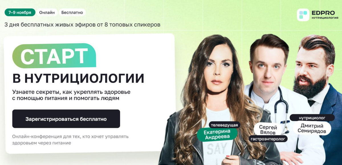 На встрече соберутся лучшие из лучших 一 7 экспертов в области здоровья: врачи, нутрициологи, психологи🔥 Спикеры разберут самые актуальные темы: 一 Что делать при застое желчи, анемии, высыпаниях на коже, недостаточной или избыточной кислотности 一 Как понять, что с кишечником проблемы, и решить их 一 Какие специи могут заменить аптечку 一 Как правильно питаться при аутоиммунных нарушениях 一 И др. 💎 Звездный гость 一 Екатерина Андреева. Да-да, та самая: 一 журналист, телеведущая — Лауреат премии ТЭФИ. 一 ведущая информационной программы «Время» на Первом канале 一 входит в десятку самых популярных телеведущих России по версии TNS RUSSIA Легенда российского ТВ в откровенном интервью поделится секретами, как ей удается выглядеть молодо, быть полной энергии и здоровья👇 Хочу участвовать: https://edpro.pw/f7w