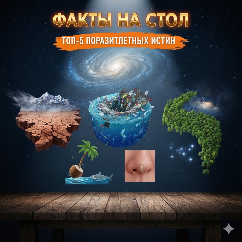 Привет всем любознательным! С вами снова "Факты на стол". Сегодня мы заглянем поглубже в уголки нашей удивительной планеты. Земля, на которой мы живем, хранит столько тайн и невероятных явлений, что иногда кажется, будто мы совсем ничего о ней не знаем. Приготовьтесь удивляться! Поехали! Когда речь заходит о засушливых местах, первое, что приходит на ум, — это Сахара. Однако по-настоящему самое сухое место на планете — это Сухие долины Мак-Мердо в Антарктиде. Да, вы не ослышались! В этой части Антарктиды не было дождя уже более 2 миллионов лет. Это возможно благодаря катабатическим ветрам, которые испаряют всю влагу, а окружающие горы не дают ледникам добраться до долин. Условия там настолько экстремальны, что ученые считают их наиболее близкими к условиям на Марсе. Это печальный, но очень важный факт. Большое Тихоокеанское мусорное пятно (Great Pacific Garbage Patch) — это огромная территория, где из-за океанских течений скапливаются пластиковые отходы. Его площадь оценивается от 700