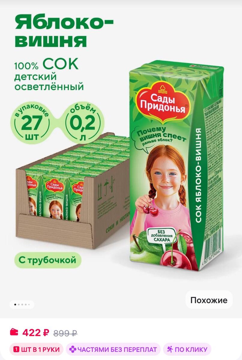 Сады Придонья Сок яблоко-вишня 0,2л , с 5 мес (27шт) По 15 р за шт https://www.wildberries.ru/catalog/11577700/detail.aspx?size=36622264 Актуально на момент публикации ✅ Подписаться 🔣 Промокоды тут