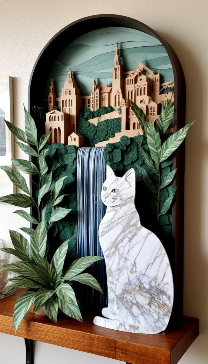 Экспериментальный вечер и не только. 💡Мой второй канал с необычными промтами. Присоединяйся =) Странное сочетание материалов, поэтому его эстетика не всегда сетям удается. Но. если покрутить, то можно чего-то достойного и получить =) ✏️Промт: paper+volumetric art, split art deco rock+marble cat's silhouette-shaped panel on the shelf, side view, stains-like shape, curved line art+plants, photo realistic spiral fiber village+waterfall Участвуют: Шедеврум (первые две генерации). Обе тестируемые версии рисуют. В 2.5 больше бумажности, в 2.7 мраморности. С одной стороны, в 2.5 больше разнообразия, но 2.7 постабильнее. В общем, версию выбирайте по вкусу =) Imagen 4 (две генерации). Самый необычный и непредсказуемый сегодня. Так как подобное мне нравится больше, то отдам первое место =) Flux (две генерации). Тоже непредсказуем, но эстетика может быть иногда сомнительной. Midjourney (две последние генерации). Тут уже скорее полноценные интерьерные решения чаще получаются, чем некие ми