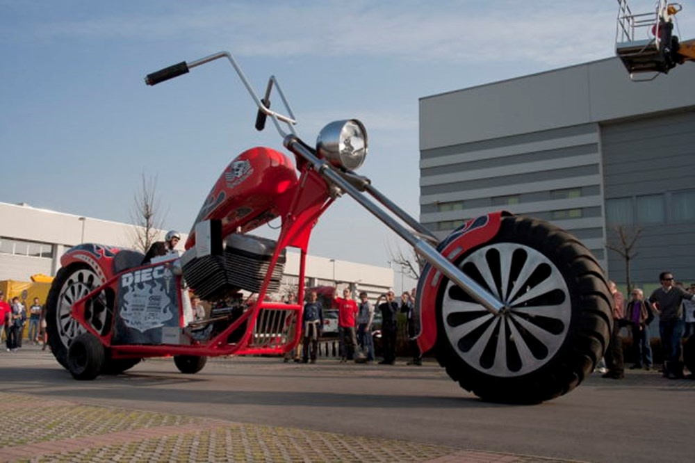 В этой статье вы познакомитесь с самым большим мотоциклом в мире, который официально зарегистрирован в Книге рекордов Гиннеса. Мы расскажем вам его удивительную историю. • Regio Design XXL Chopper: • Итальянский дизайнер Фабио Реджиани создал поистине впечатляющий мотоцикл, который весит до 5 тонн и в 6 раз превышает размеры обычного. Его высота от земли до руля составляет 5,10 метров, что делает его одним из самых высоких мотоциклов в мире. • Сборку этого гиганта осуществляла команда из семи человек в течение семи месяцев. Мотоцикл оснащен 5,7-литровым двигателем V8 мощностью 280 л.с., который способен развивать скорость до 100 км/ч. Для обеспечения стабильности и устойчивости Фабио добавил несколько дополнительных колес. • Долгое время «королём» всех мотоциклов считался Gunbus 410, созданный немцем Клеменсом Леонардом. Однако в 2013 году представители Книги рекордов Гиннесса зафиксировали смену «хозяина престола» в королевстве двухколёсных транспортных средств. • Фабио Реджиани,