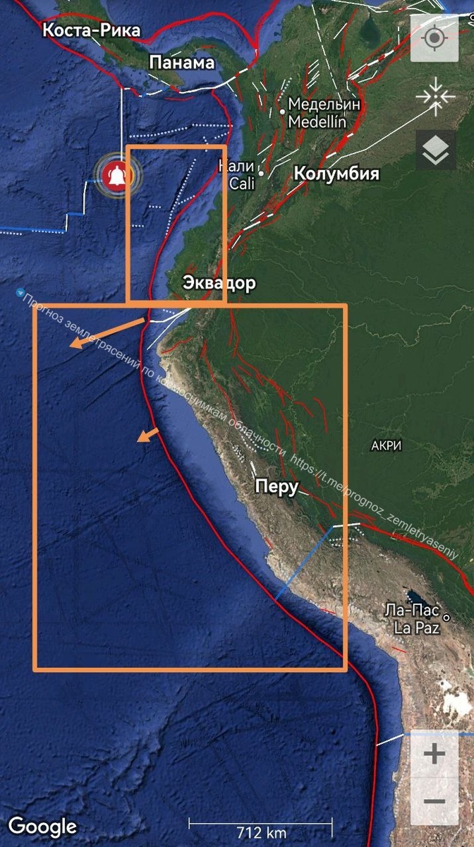 В Южной Америке сильное тектоническое напряжение и дегазация наблюдаются от Перу до Эквадора (М7+), а также вдоль Тихоокеанского побережья Колумбии (М6+) ====== In South America, strong tectonic stress and degassing are observed from Peru to Ecuador (M7+), as well as along the Pacific coast of Colombia (M6+)