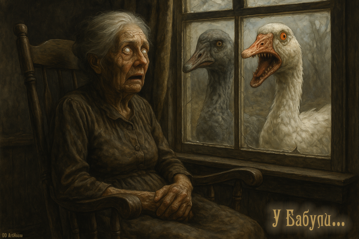 *** Тишина в доме была не просто отсутствием звука. Она была густой, вязкой, как испорченный мёд, и пахла пылью, лекарствами и тем сладковатым запахом тления, что исходит от старой, отмирающей плоти. Бабуля сидела в своём кресле-качалке, неподвижная, как изваяние. Её глаза, затянутые влажной пеленой катаракты, были устремлены в окно, за которым медленно угасал осенний день. Они были её единственной нитью, связывающей с миром. Два весёлых гуся. Серый и Белый. Она не помнила, когда они появились. Казалось, они были всегда. Сначала они и впрямь были весёлыми. Их гогот наполнял двор жизнью. Но с тех пор, как её зрение окончательно помутнело, а ноги перестали слушаться, их веселье стало иным. Оно стало… неестественным. Один – Серый – был больше, грубее. Его клюв, когда-то жёлтый, почернел, будто обуглился. Другой – Белый – казался хрупким, почти бесплотным, его перья были неестественно белыми, как саван. И их гогот… он больше не был просто криком. В