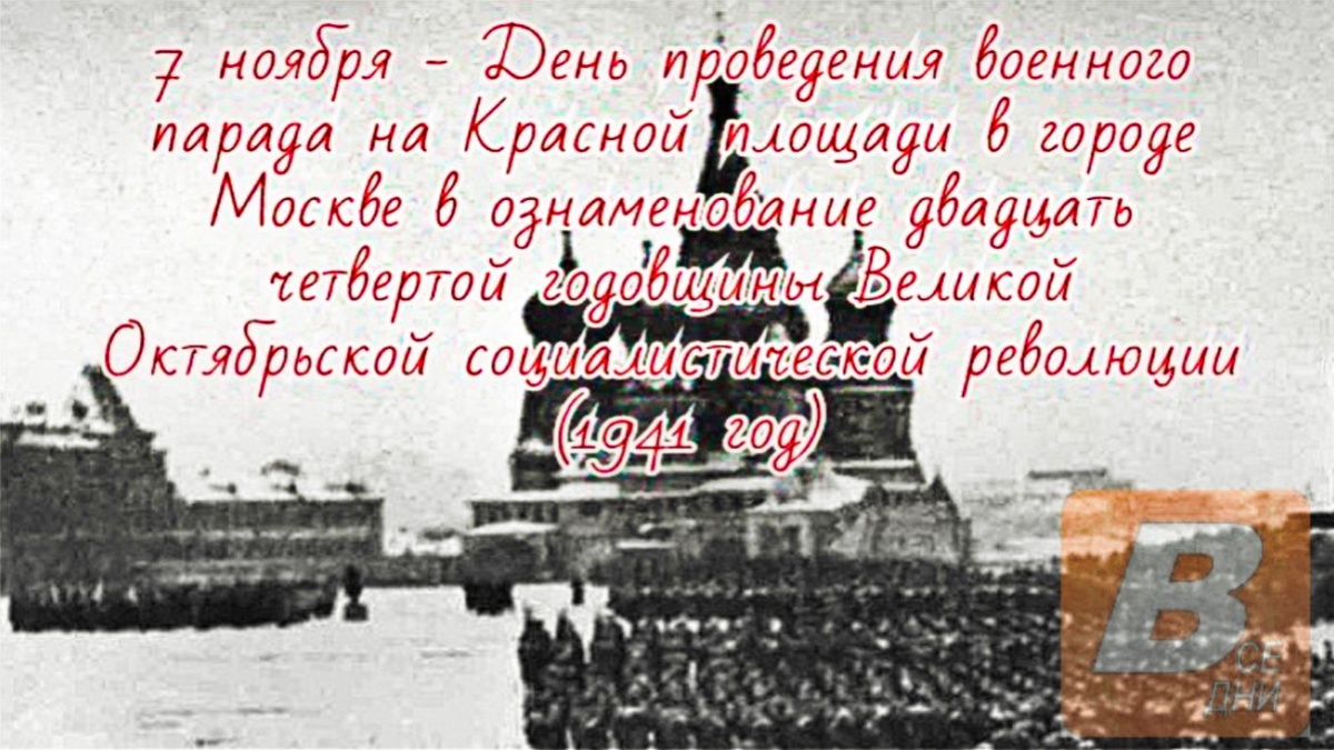7 ноября 2025 года - День воинской славы - День проведения военного парада на Красной площади в городе Москве в ознаменование двадцать четвертой годовщины Великой Октябрьской социалистической революции (1941 год). Подробнее: https://www.vse-dni.ru/2023/10/7-november-kakjy-prazdnik.html