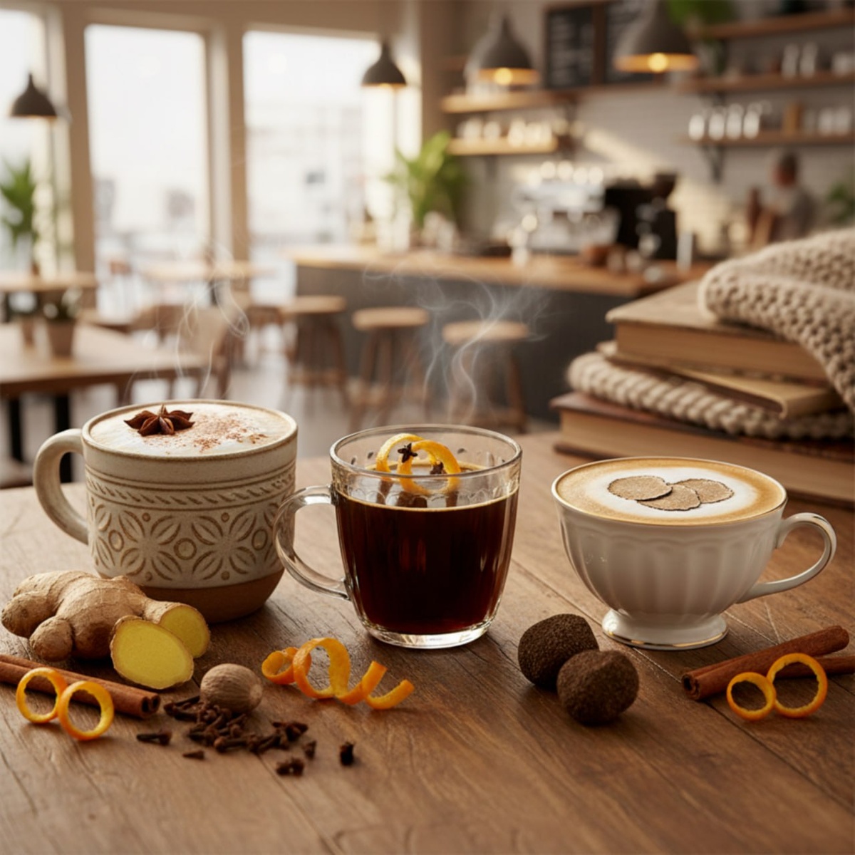 пряный латте с согревающими специями, лёгкий и освежающий фильтр кофе с апельсином и гастрономический кофе с трюфелем.