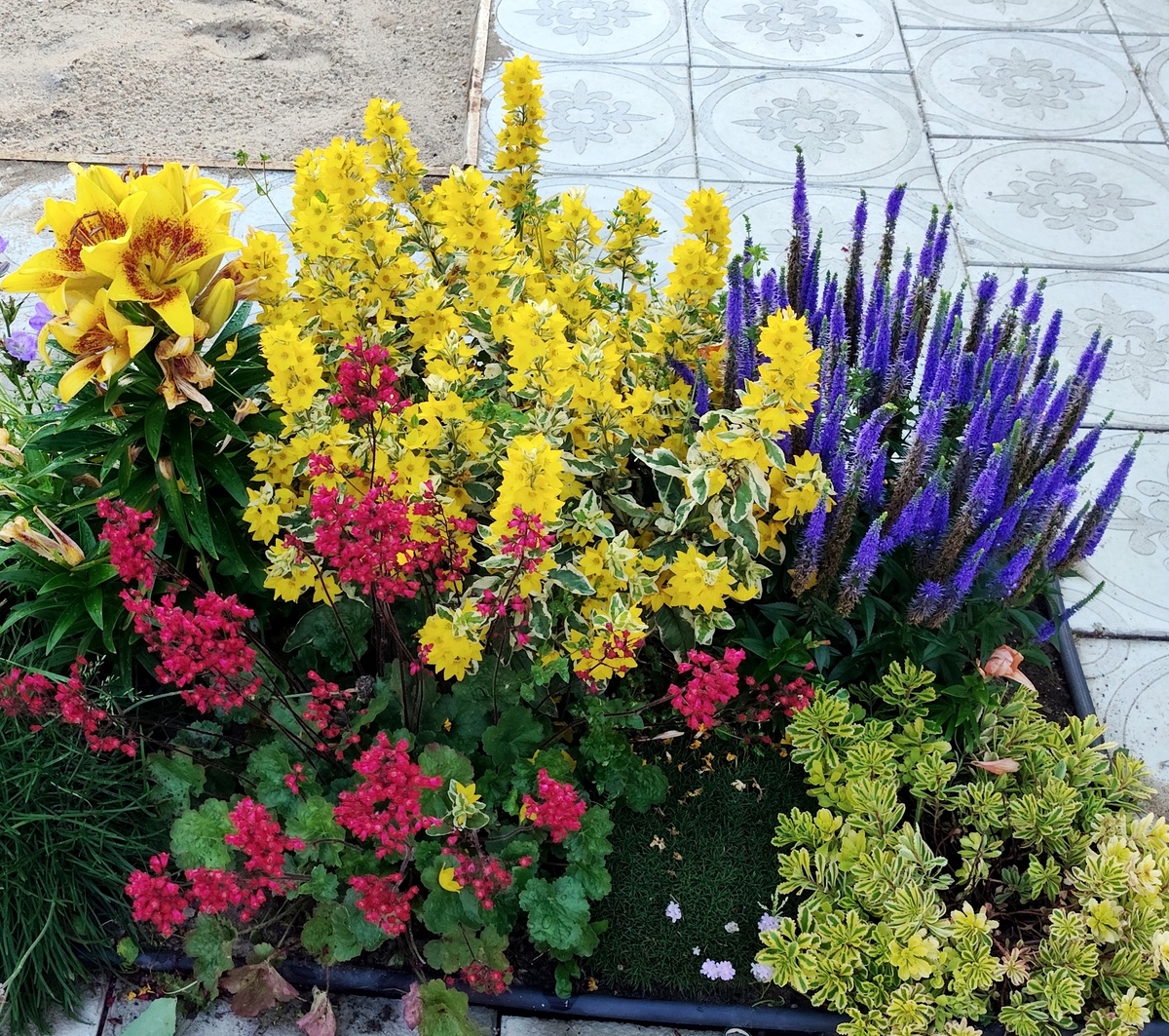 Если говорить о концепции клумбы, то задачи были следующие: Условия: тень, полутень, солнце и засушливость места. Не могу сказать, что это окончательное решение, но правки планирую только вот в этом месте. Многое, что там посажено - не плановая посадка, а временная. Нежная бело-зеленая астранция теряется. Монарда выбивается из общего колорита, лилия неопрятно смотрится после отцветания, гортензия тоже не по колориту... Глядя на это фото подумала: ну вот что то тут цветет... Красиво?! 😁 Нет, сами цветы красивые, но они не делают красивой клумбу, к сожалению. Зато клумба непрерывного цветения!))) ☝️ 1 июня уже повеселее: цветут примулы Зибольда, аквилегия и анемонелла василистниковая. Середина июня еще нарядней: хороши хосты, ажурные листья астильб и рододендрона... В июле цветут астильбы и традесканции и начинает цветение-поглощение синяя пучина... А в середине августа уже так. И до 11 октября примерно одна и та же картина с преобладанием герани Райз энд шайн (Rise and Shine).