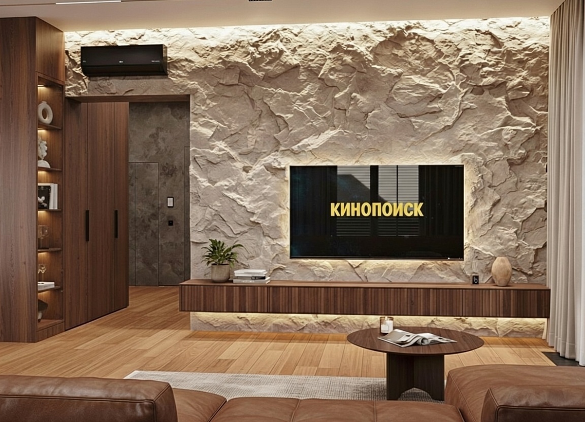 В современных интерьерах, где преобладает минимализм и ровные поверхности, рельефная структура арт-бетона или декоративного камня добавляет глубину и объем, превращая стену с телевизором в центральный элемент гостиной.
