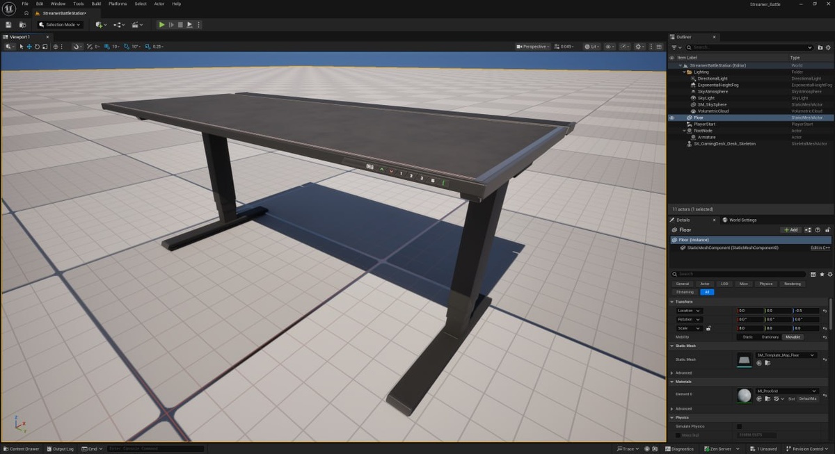 Перенес стол из Blender 5 в UE🚀 Сегодня впервые экспортировал модель с арматурой из нового Blender 5 в Unreal Engine 5.7 📦 Что получилось: ✅ Skeletal Mesh (префикс SK_ у модели) импортирован — геометрия корректная ✅ Арматура перенеслась ✅ Материалы настроены — включая прозрачность для декалей на кнопках панели управления, с прозрачностью пришлось немного разобраться. 🔍 Момент с костями: Сначала думал, что кости не экспортировались — не видел их в viewport 😅 Оказалось, они есть — видны в Skeleton Tree (справа на скриншоте). Но визуально очень мелкие. Как с ними работать в UE и как управлять через Blueprint — ещё предстоит разобраться. Это отдельная задача на следующие дни. Пока ничего не понятно.🙈 ⏱️ Время: ~40 минут — на экспорт, импорт, настройку материалов и поиск костей в интерфейсе 📝 Что дальше: Разобраться, как управлять костями в UE Настроить Blueprint для изменения высоты стола Понять, правильно ли всё настроено или нужны корректировки, может что-то просто не правильно