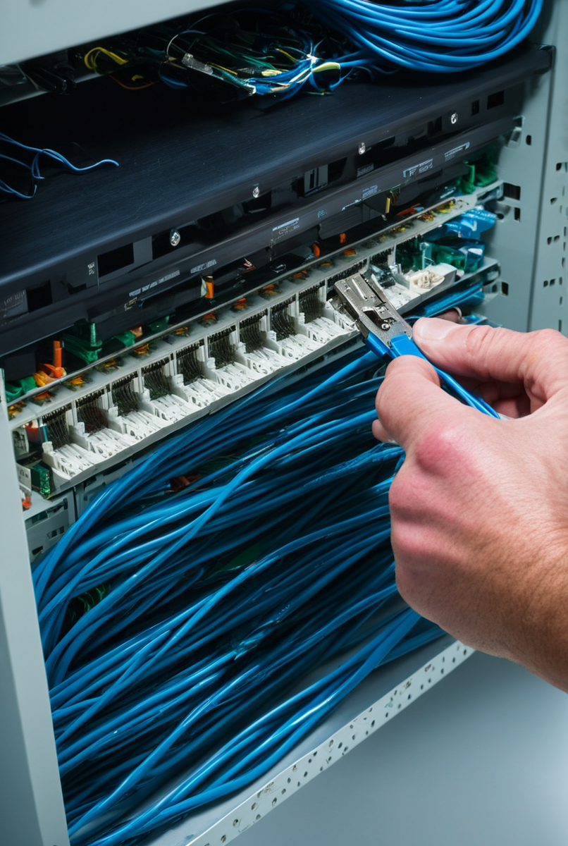 Расшивка кабеля — иной способ терминирования. Здесь применяется ударный инструмент (кроссировочный нож) для подключения жил к патч-панели или для операции заделка модуля Keystone в модули. Инструмент с силой проталкивает провод в IDC-контакт‚ одновременно прорезая изоляцию и обрезая излишек. Точность этих операций — залог стабильной работы сетевого оборудования.