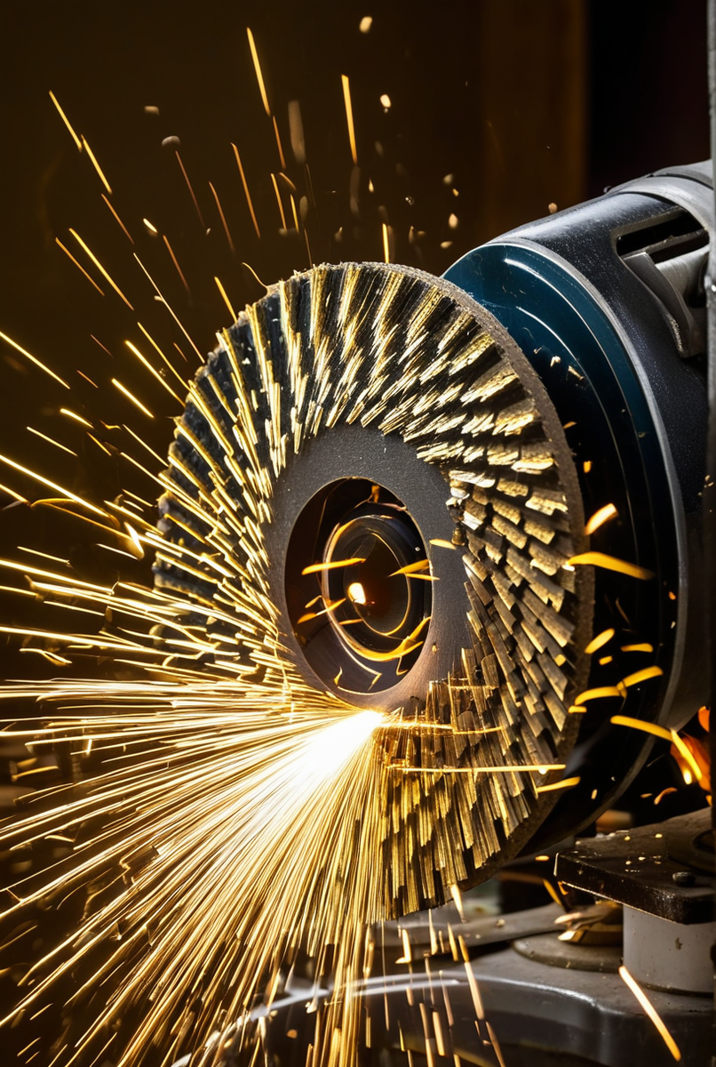 - Конический диск: Лепестки расположены под углом ~15°. Конический круг создан для агрессивной работы, быстрой зачистки сварных швов, обработки кромок и сложных контуров. Угол наклона позволяет работать в более удобном положении и повышает давление на зону обработки, увеличивая производительность.