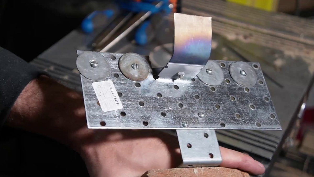 Порванную пильную ленту для ленточной пилы можно довольно быстро отремонтировать с помощью пайки латунью. Для этого нужна газовая горелка, латунь и флюс. В сети встречались рекомендации по пайке пильной лентой серебряными припоями, но поискав такой припой в интернет магазинах и изучив тему пайки твердыми припоями, я решил, что можно с успехом пользоваться латунью в качестве припоя. К тому же латунь оказалась более доступна. После нескольких попыток пришло решение, что нужно сделать небольшое приспособление чтобы обеспечить достаточную температуру в области пайки. Это приспособление я собрал из того что нашлось под рукой и что можно было быстро купить в ближайшем строительном магазине. Оно состоит из перфорированной пластины, закрепленной с помощью такого же уголка к доске. В пластине сделаны пара пропилов и отогнут угол, к которому закреплена металлическая полоса в виде параболы, она служит отражателем и помогает повысить и удержать нужную температуру в районе пайки Для закрепления пи